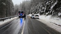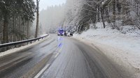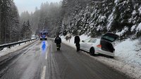 Das Fahrzeug ist auf der schneeglatten Fahrbahn von der B119 abgekommen und hat sich im Bankette festgefahren.